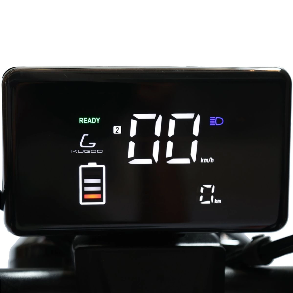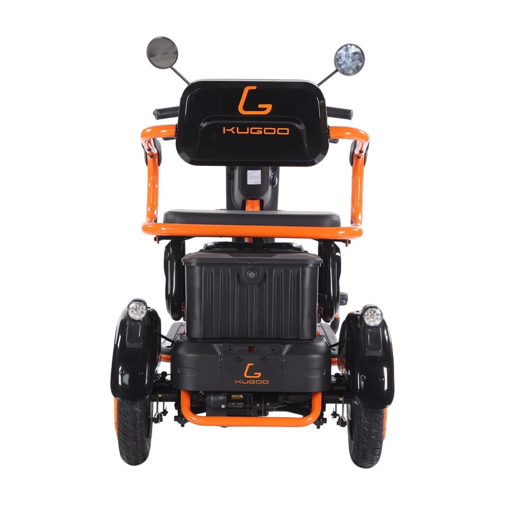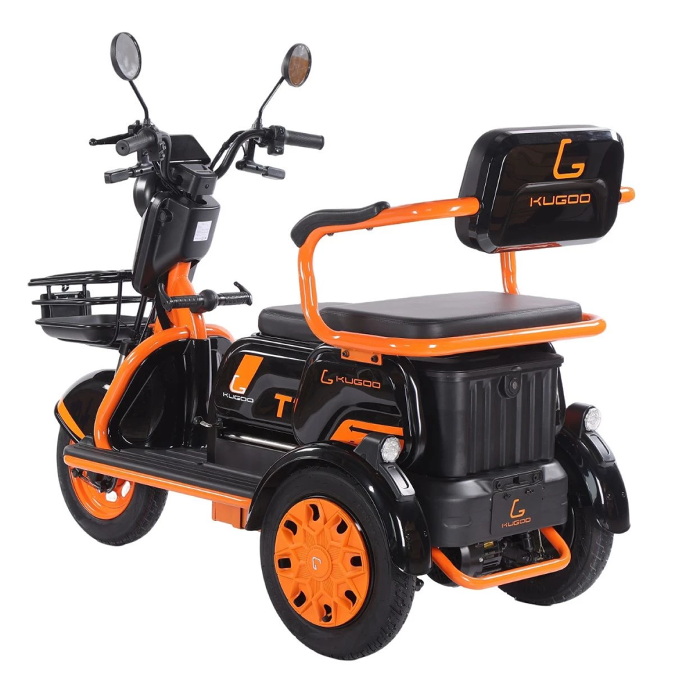 Kugoo T1 — это компактный трёхколёсный электровелосипед с прочной алюминиевой рамой, задним приводом и мотором мощностью 500 Вт. Оснащён литий-ионным аккумулятором 48 V / 20.8 Ah, 3-ступенчатой трансмиссией и барабанными тормозами.
